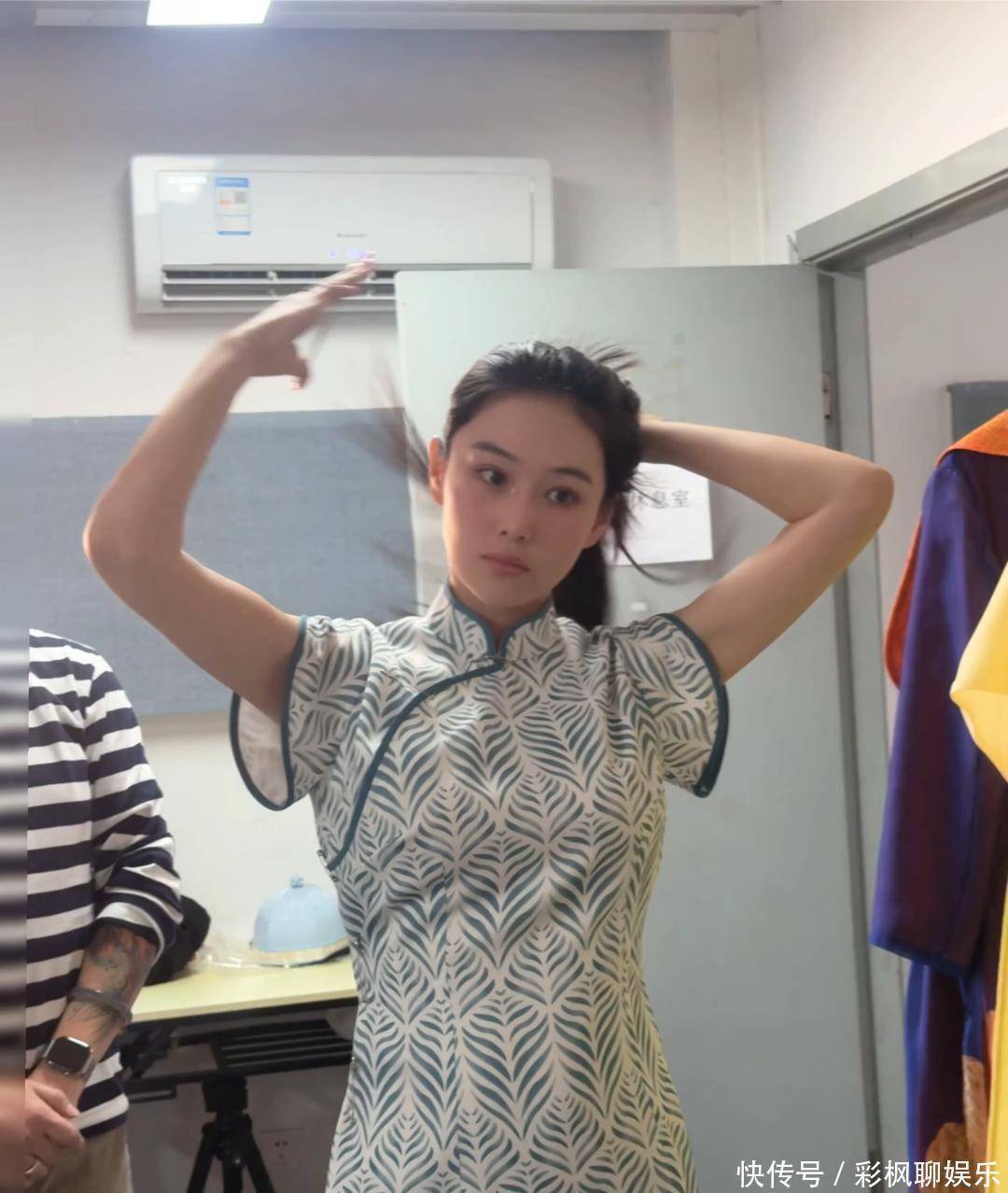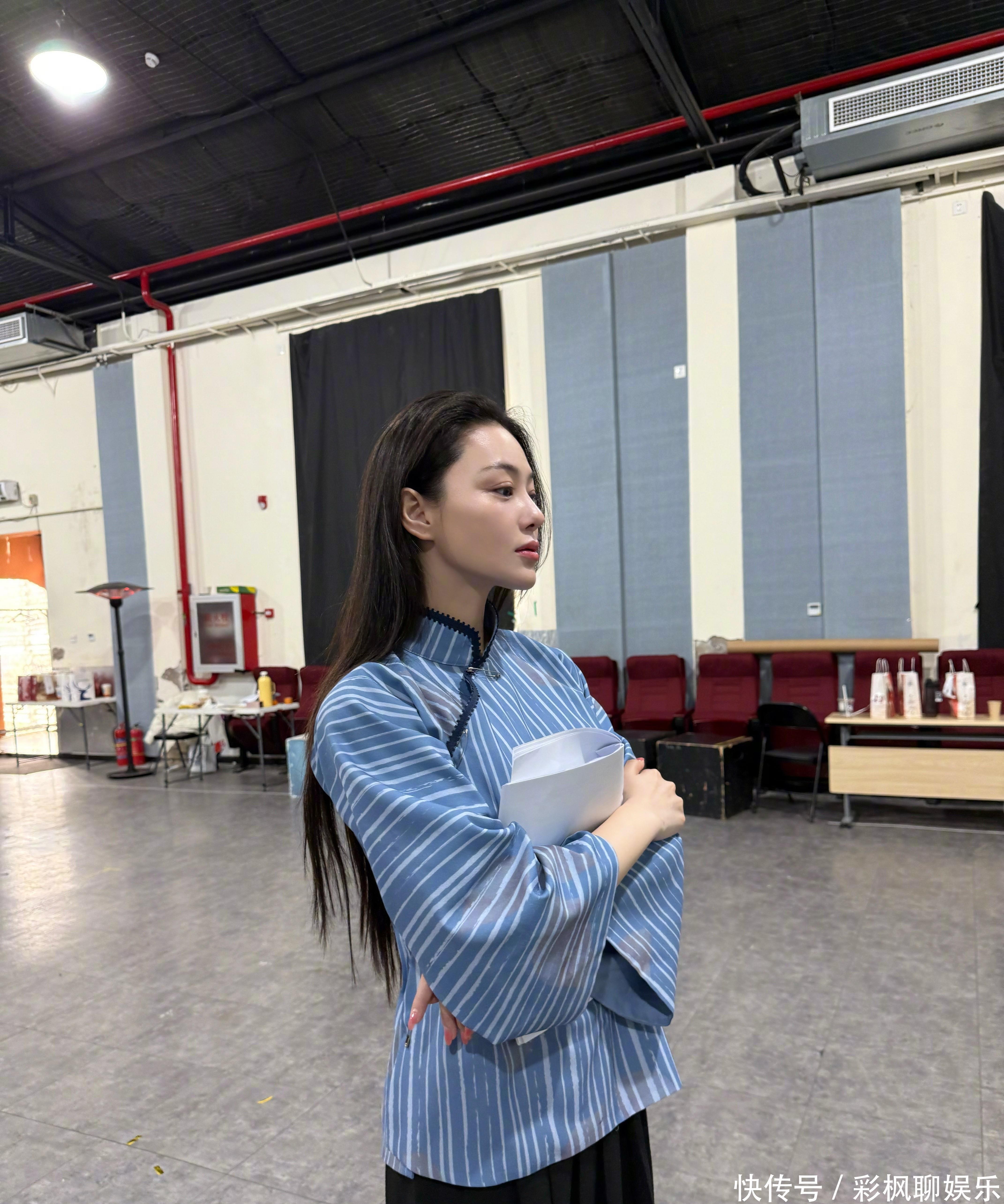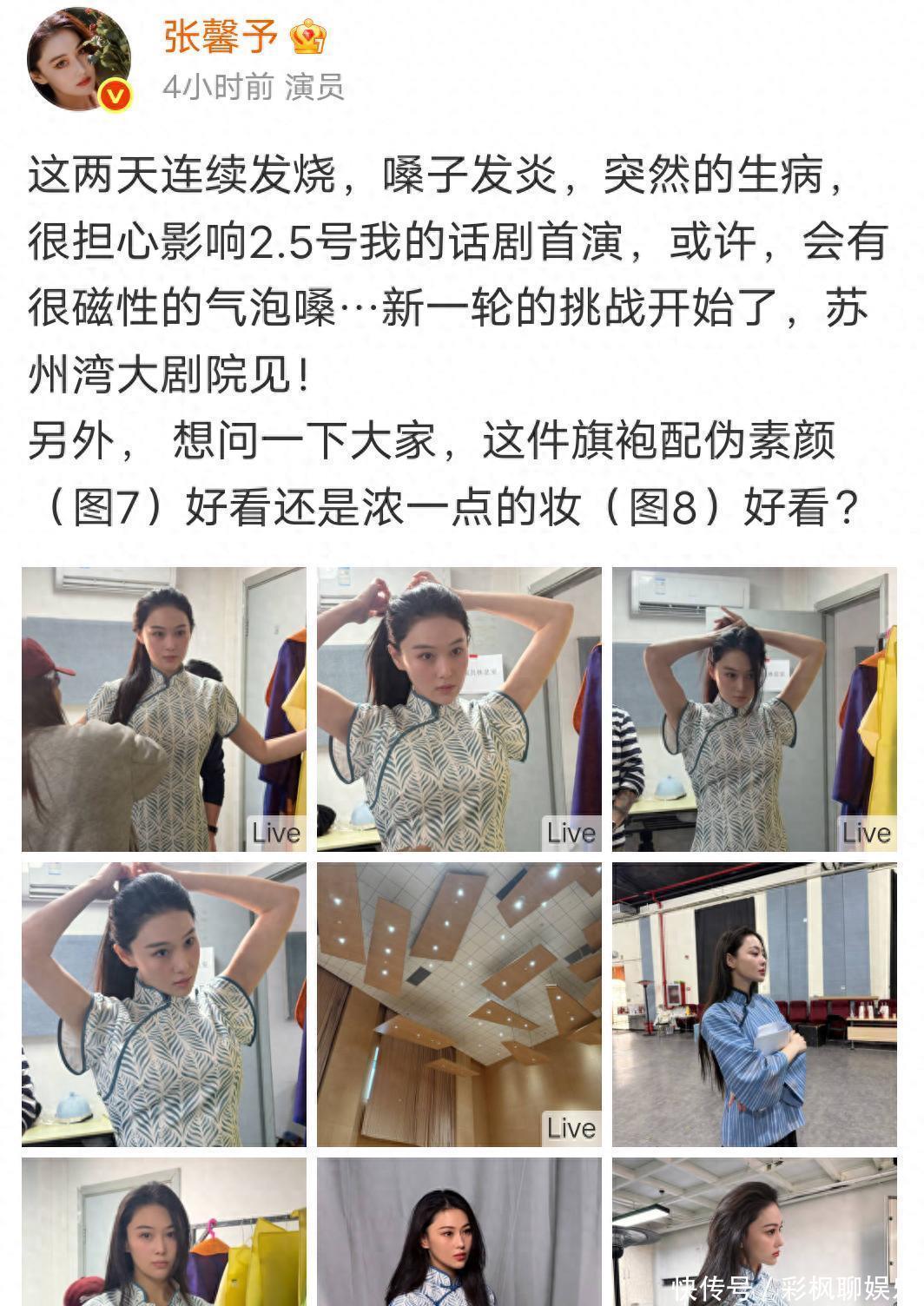1月17日张馨予在社交平台分享自己带病坚持工作状态:连续两天发烧,嗓子还发炎,但这姐们儿硬是没停下排练,照样一身短旗袍站在话剧舞台上。要我说,这敬业精神真没得挑。